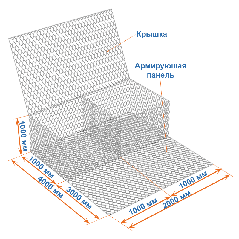 Габион с армопанелью 4x2x1 представляет собой коробчатый габион, состоящий из двух частей: основного короба и армирующей панели. Армопанель – это продолжение основания габиона.