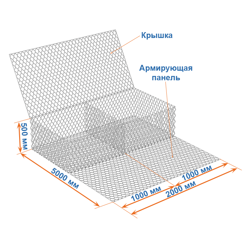 Габион с армирующей панелью 5x2x0,5 – это коробчатый габион с удлиненным основанием, которое образует подобие «хвоста».